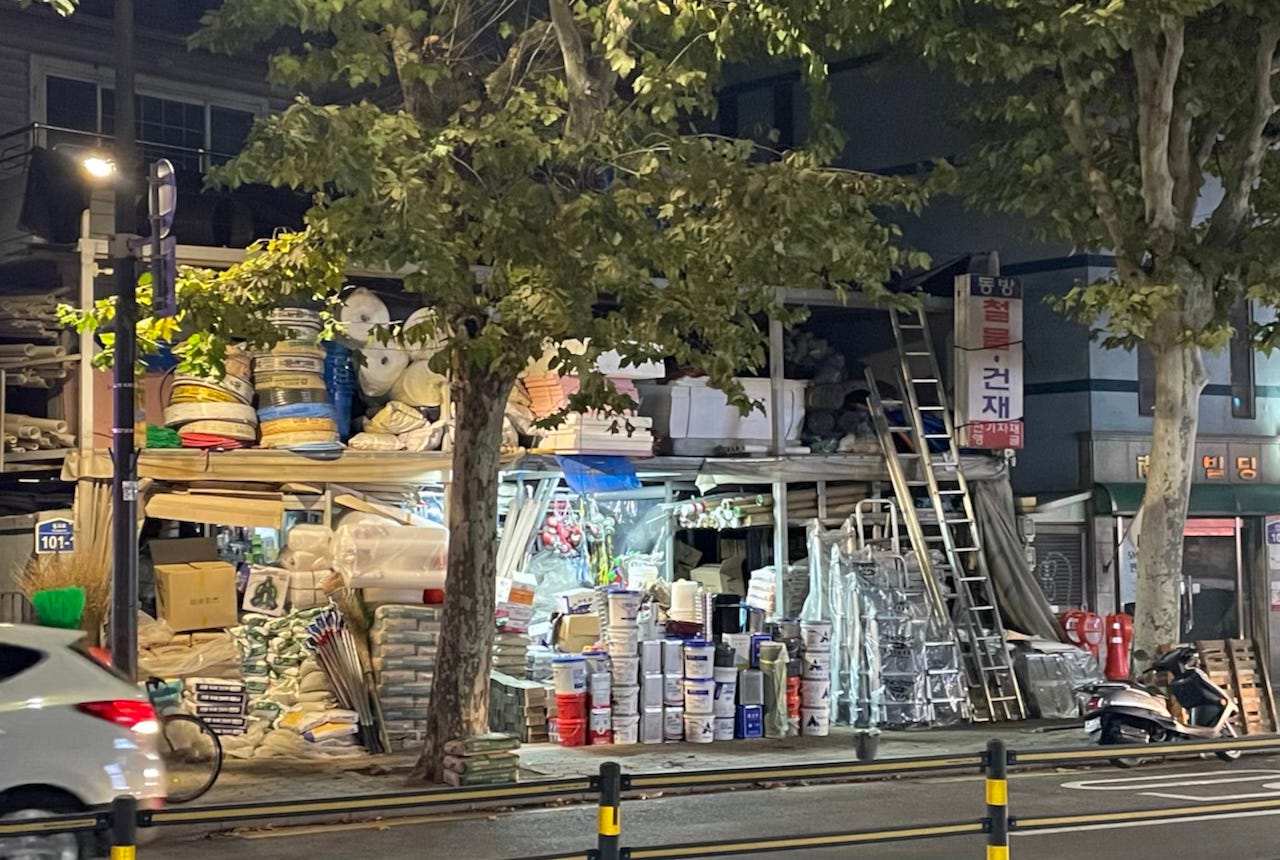 Near our guesthouse, we often walked past the hardware store pictured below. It was run by an elderly man, and every nook, cranny, sneaky extra floor and tiny corner and even most of the footpath were taken up by the goods. It was very well frequented but it struck us as reminiscent of an older Seoul, not the modern, extremely safety-conscious city we were otherwise experiencing. We smiled every time!