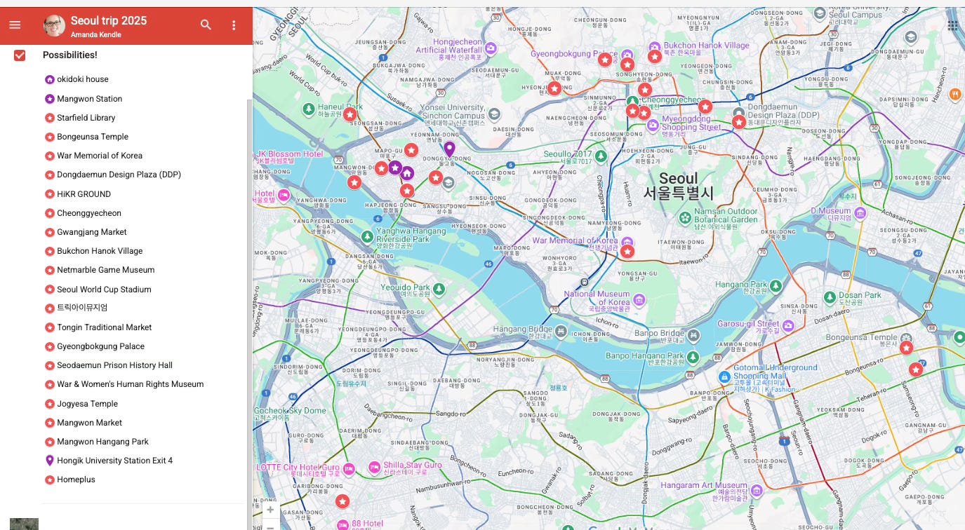 Along with a bit of googling, I brainstormed a list of places in Seoul that would appeal to me, or my son, or both, and then I threw them onto a Google Map.